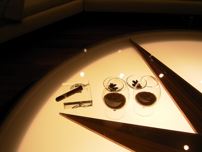 Teakwood, often used for the interior of cruise ships, is chosen as a base material with brass, glass and blue pearl granite, blue color paint.
