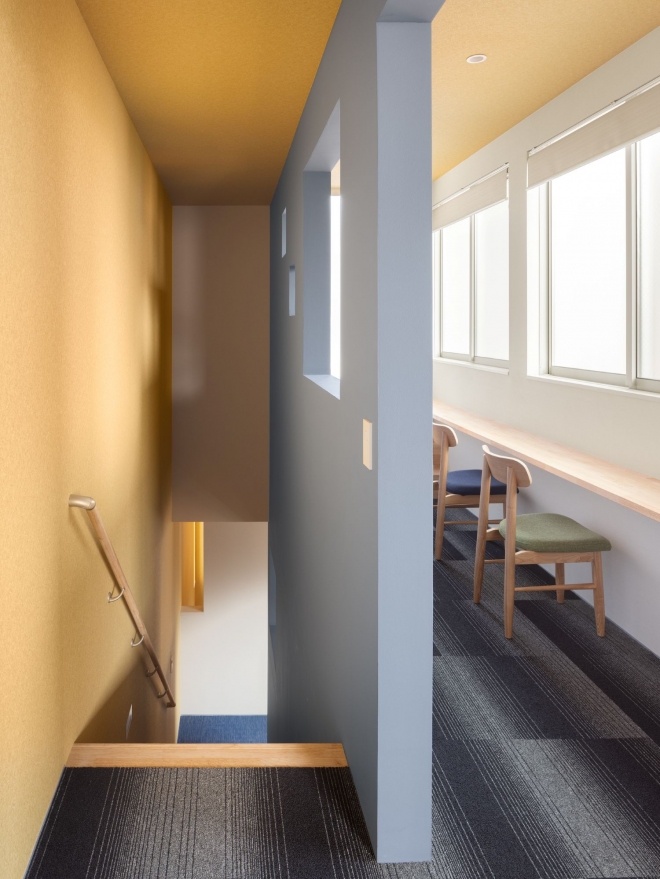 また、建物の中央にある階段の壁に開口を設けることで、中庭に面した窓から自然光が時間と共に角度を変えて降り注ぎます。
